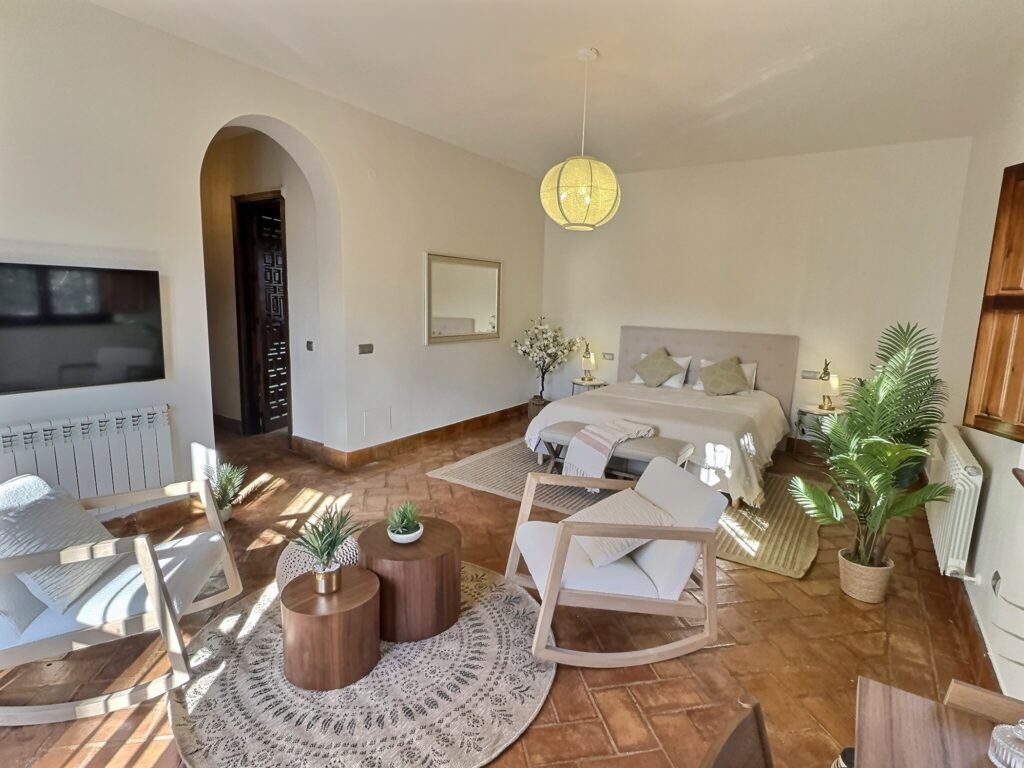 A beautiful, spacious bedroom with a comfortable seating area and an en-suite bathroom featuring a bathtub.
