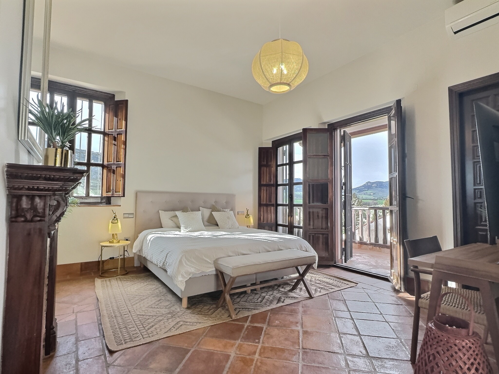 A bright bedroom with a fireplace, a private balcony, and a private bathroom.